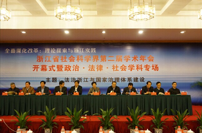 2014年11月15日,浙江省社会科学界第二届学术年会开幕式暨政治• 法律•社会学科专场在杭州隆重召开,本次会议由浙江省社科联与浙江财经大学联合主办,来自省内高等院校、高校社科联、社科研究基地、政府部门的350余名代表参加了会议。
