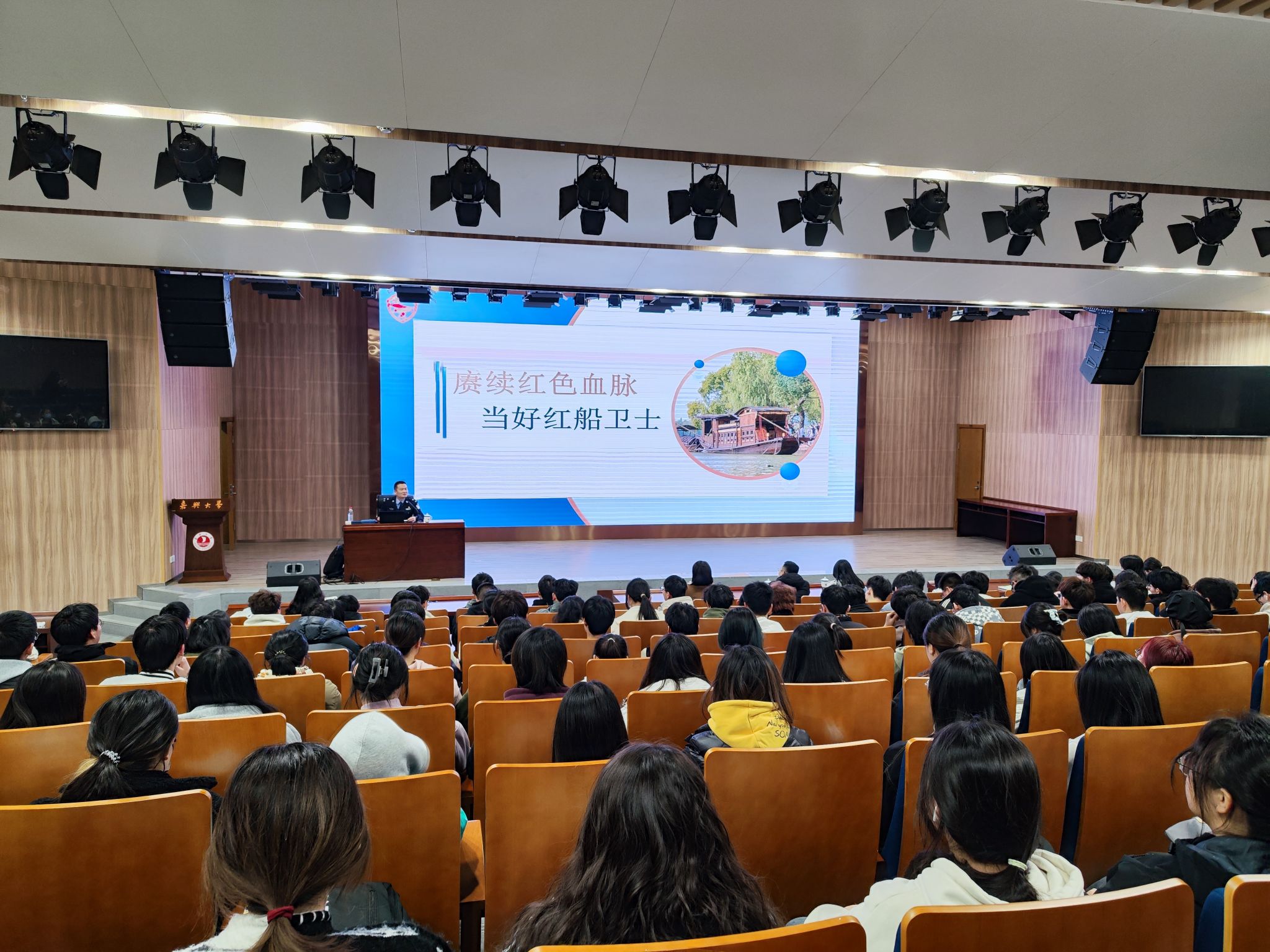 朱月倩用简练又朴实的语言讲述了一个个守护红船、践行红船精神的故事,诠释了不忘初心、牢记使命的职责。讲座中,朱月倩同志介绍了距离红船最近的派出所——嘉兴市公安局南湖分局七一派出所。在一名名党员民警、辅警的共同努力下,七一派出所形成了以“起航”为核心的系列品牌,打造出“1-3-7”的总体工作格局。他表示,七一派出所将立足本职,坚决当好“红船精神”的守护者、传承者和践行者,以“护旗手”的职责使命,坚决扛起为党守根护脉的首位担当。讲座最后,朱警长还不忘提醒同学们绷紧防范之弦,谨防新型诈骗,并细致回答了同学们提出的问题。