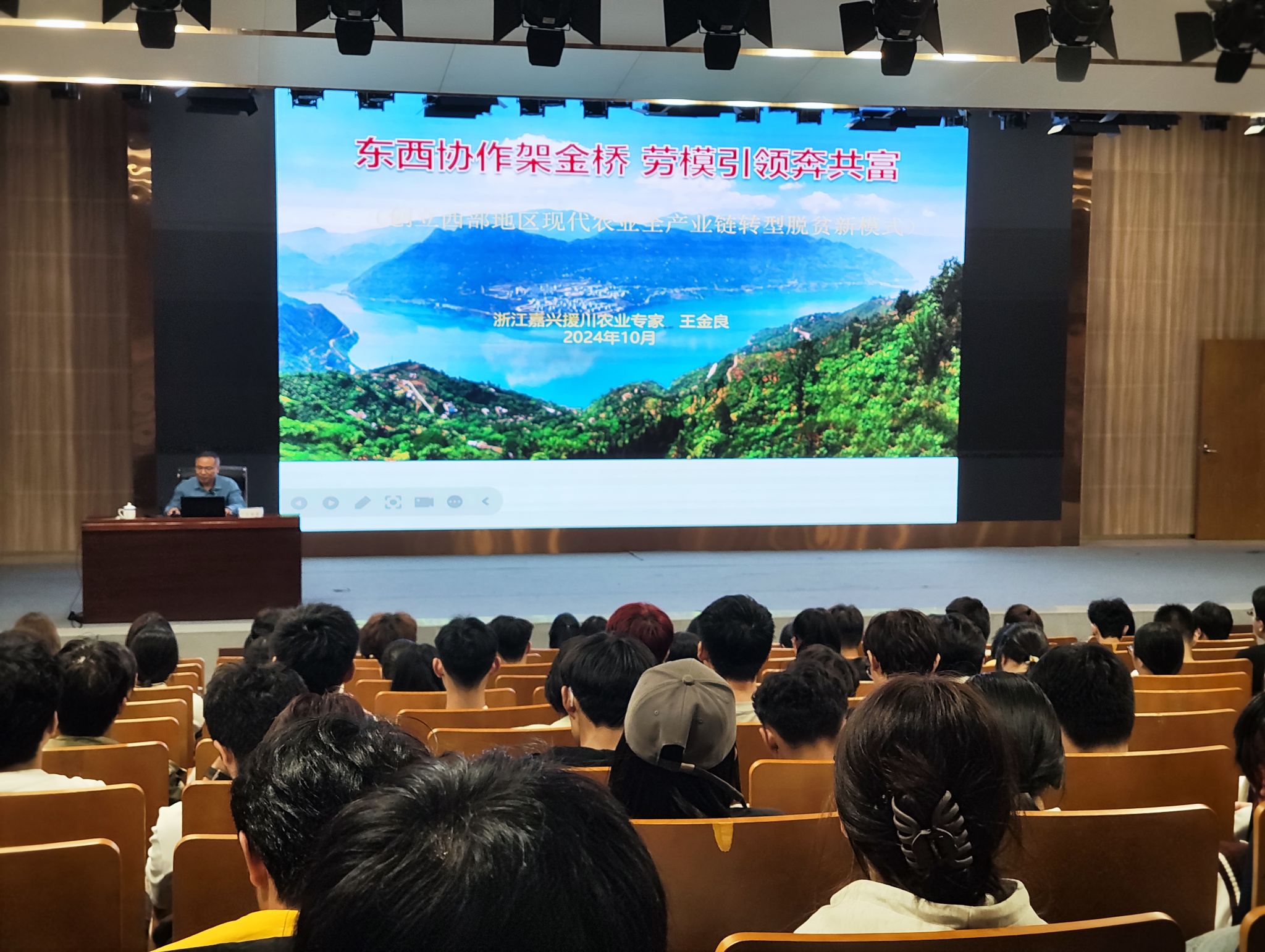 2024109日下午,由五楼自拍 、五楼自拍 红船精神传承名师工作室、五楼自拍 德法教研室主办的“劳模进课堂”系列讲座在校图书馆一楼报告厅举行,本次课邀请了全国先进工作者、全国“五一”劳动奖章获得者援川农业专家王金良为大家作题为“东西协作架金桥,劳模引领奔共富”的讲座。