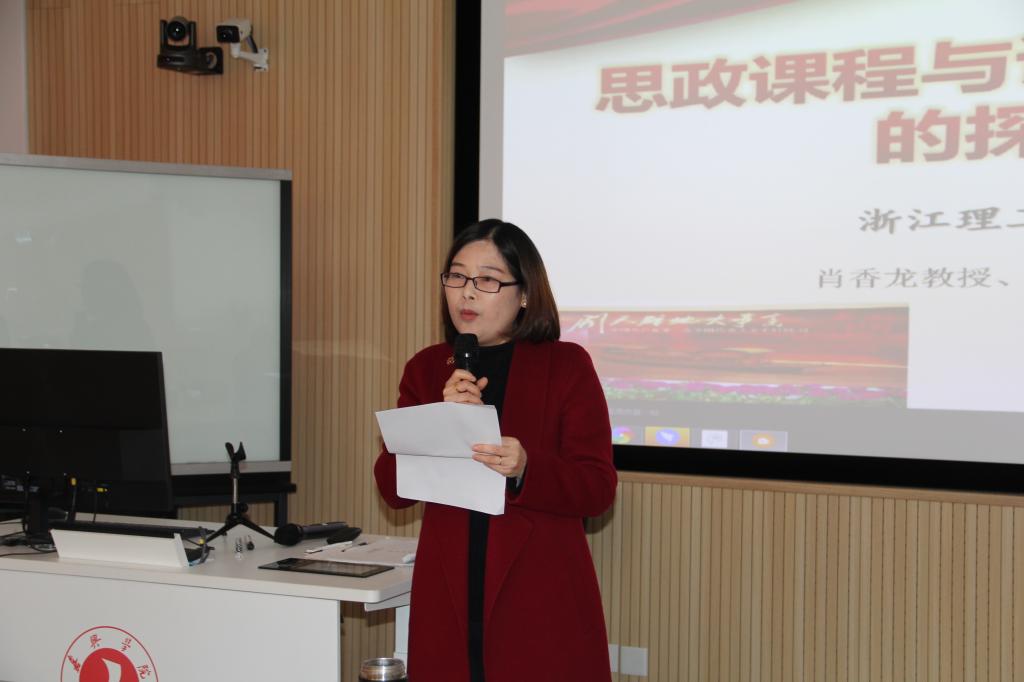 的副院长许惠芬主持教学沙龙。肖香龙以“思政课程与课程思政协同育人”为题,重点从课程思政和思政课程的概念,课程思政实践中的问题解析以及课程思政的优化设计三个维度进行分享;王凤华以“ 课程思政教学设计”为题,以丰富生动的案例分享探讨了家国情怀,品格塑造,专业伦理和科学精神四个类型的教学设计;蒋少容则从课程思政和思政课程协同构建生命教育的可能性、育人机制以及实现路径三方面分享了课程思政和思政课程协同育人的研究心得。红船精神研究中心副教授、博士杨晓伟就医学课程思政设计中如何贯穿和体现中医治病理念与王凤华进行了交流与探讨。许惠芬副院长对三位嘉宾进行了一一点评。